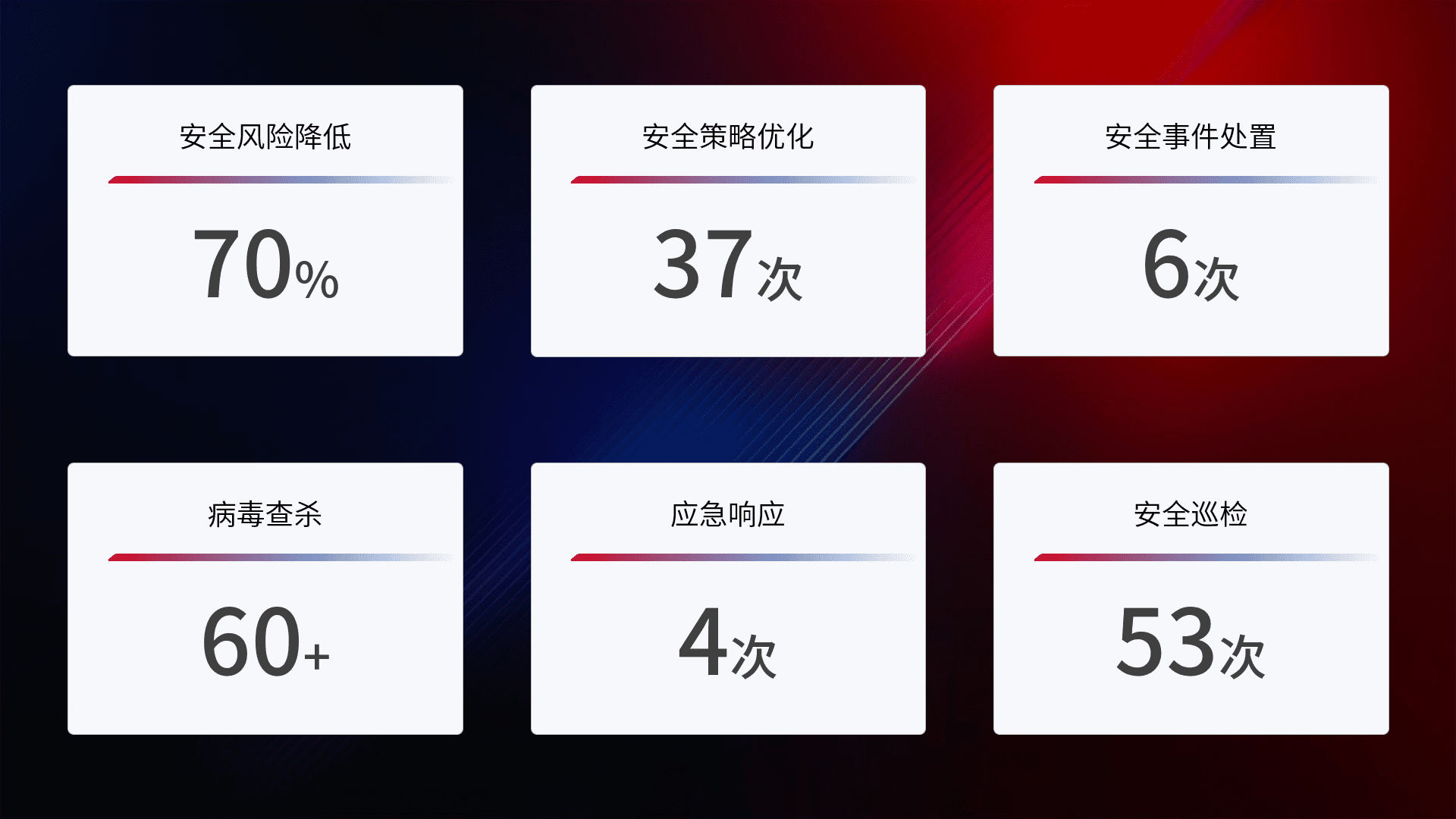 提供全面的安全事件报告体系,,,,包括处置报告、、、周报、、、季度和年度总结,,,结合持续监控,,,帮助客户深入了解网络安全状况。。。。